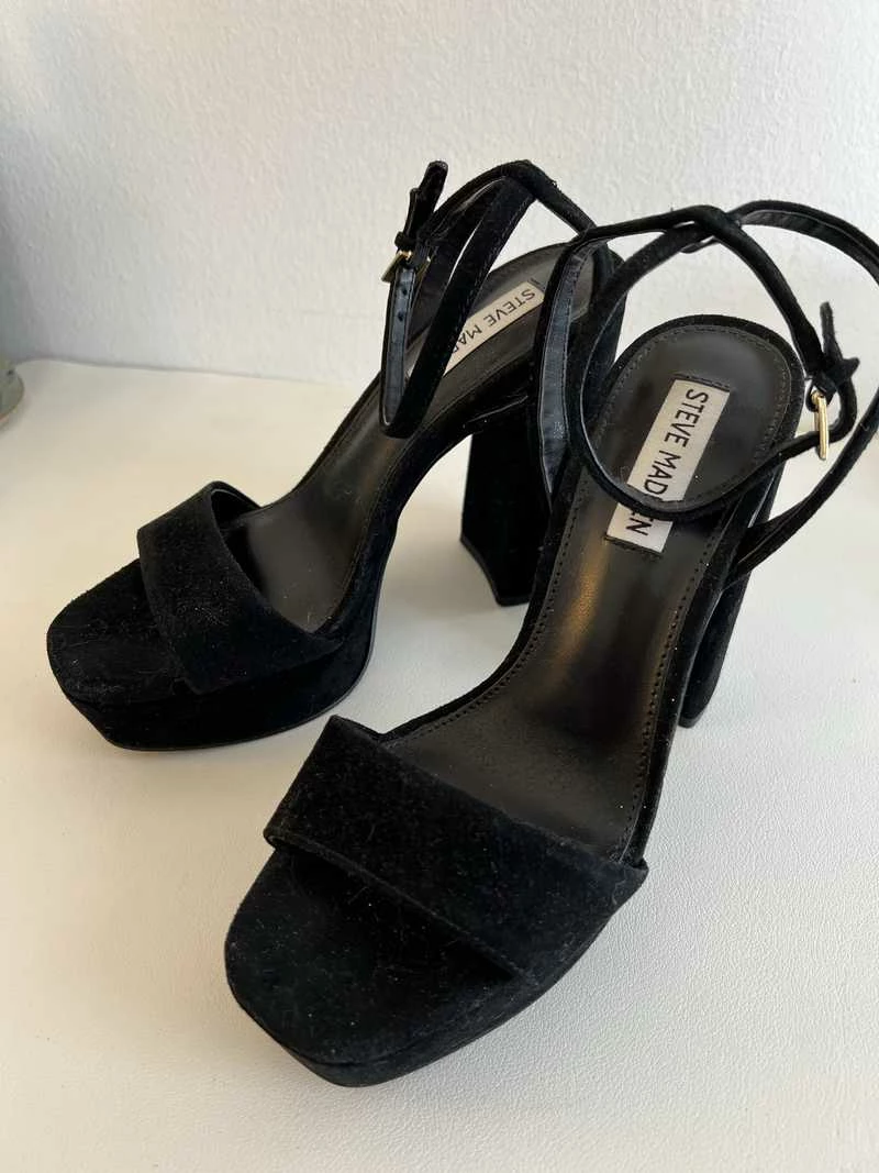 Complement formal dresses and flirty βgoing-outβ getups alike with LESSA black suede heels β a new perfectly proportioned platform sandal with a towering heel and feminine ankle strap.Β