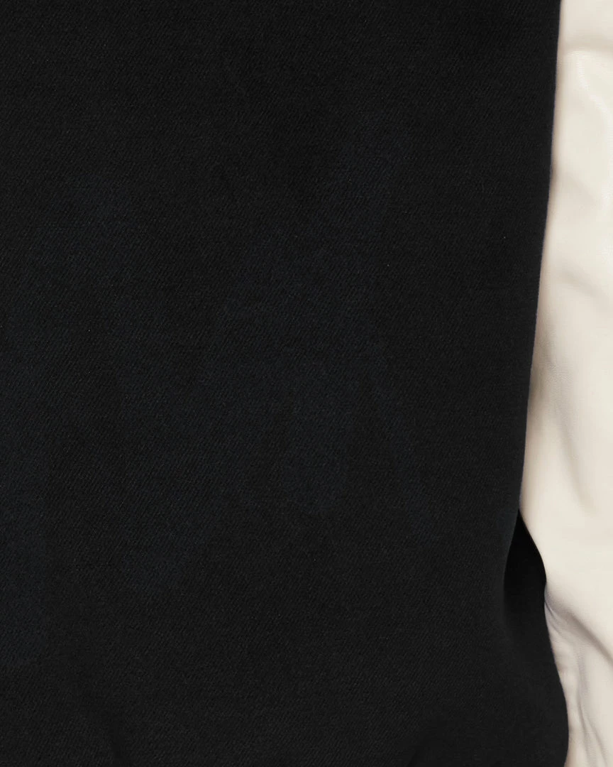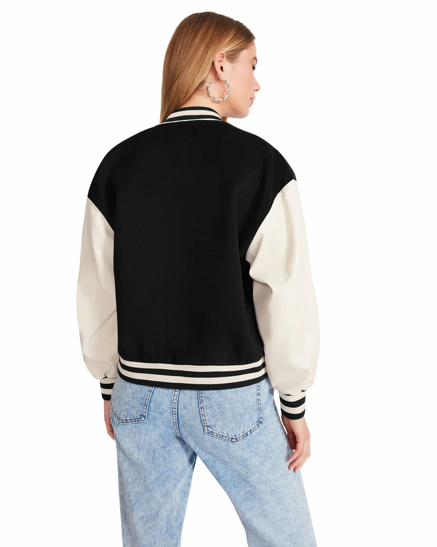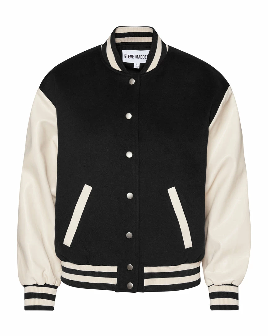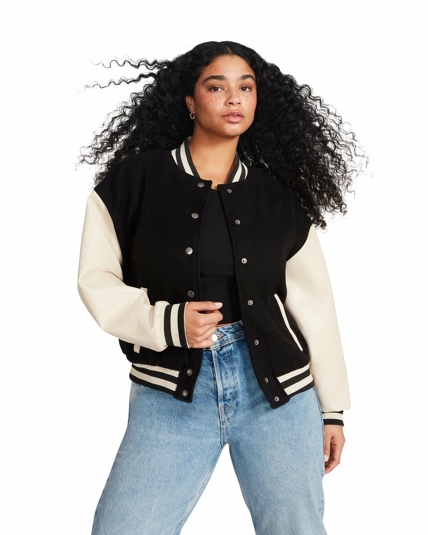 ALEXANDRA is an old-school varsity jacket with striped trim and contrast sleeves, updated with a drop shoulder for comfortable layering.