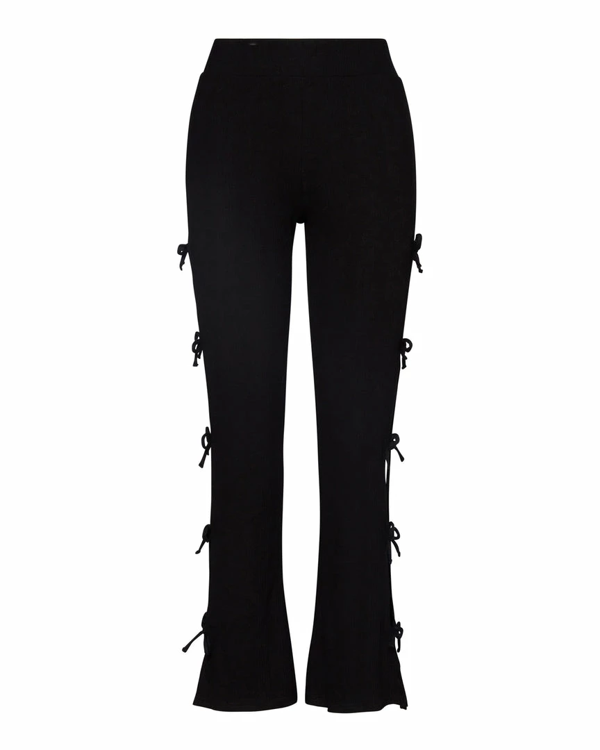 The ANGELINA pants are a high waisted straight leg design with bows connecting the split outseam.