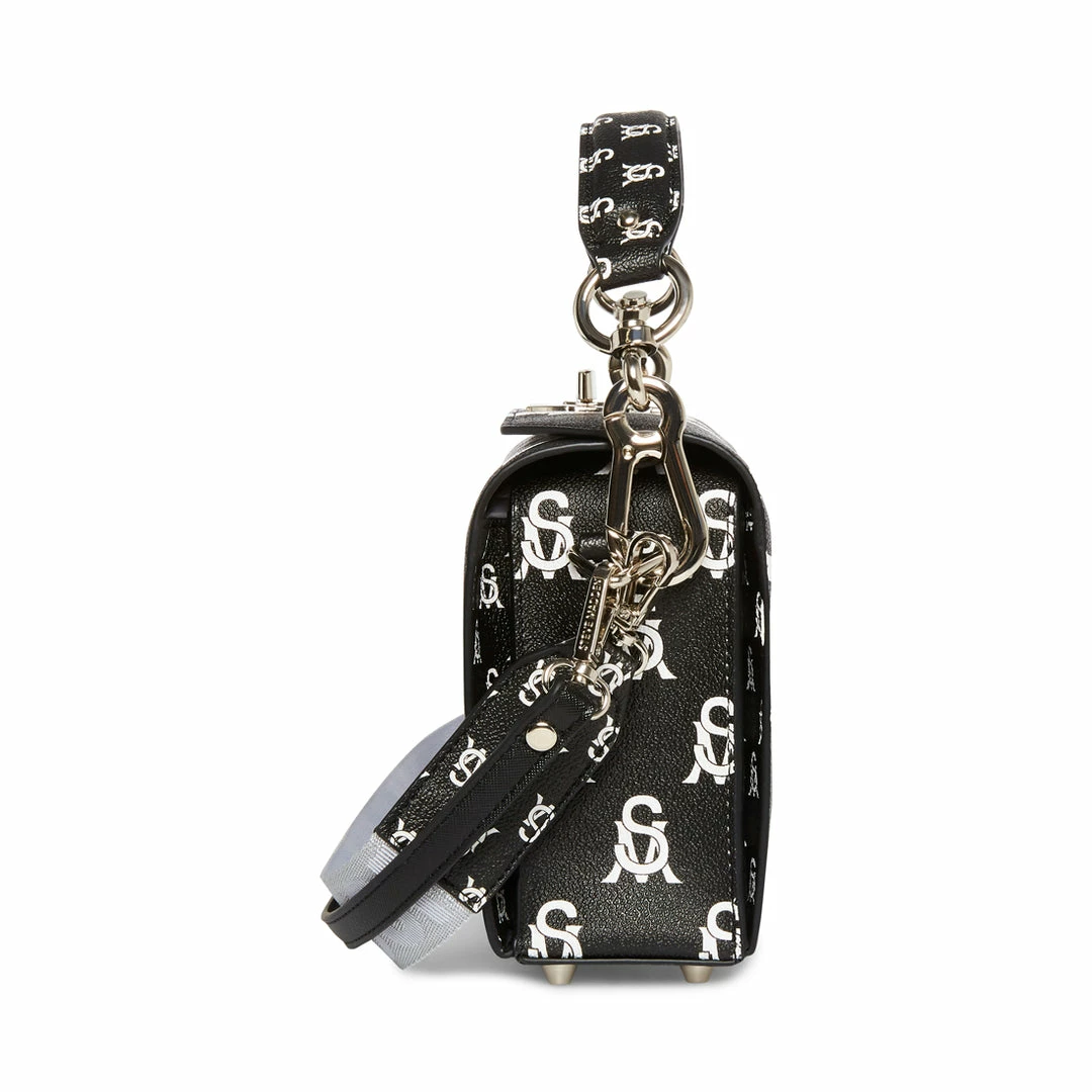 The BKINDER is a structured box purse featuring contrasting logo prints wrapped around the front and back and on the sides as well as on the interchangeable straps.