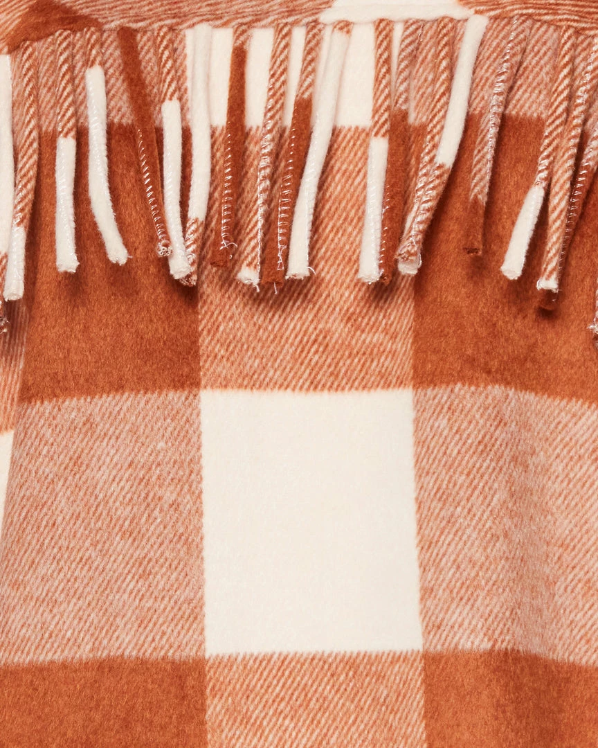 BONNIE is a shirt-jacket layer with an oversized gingham print and a fringe trim across the back.