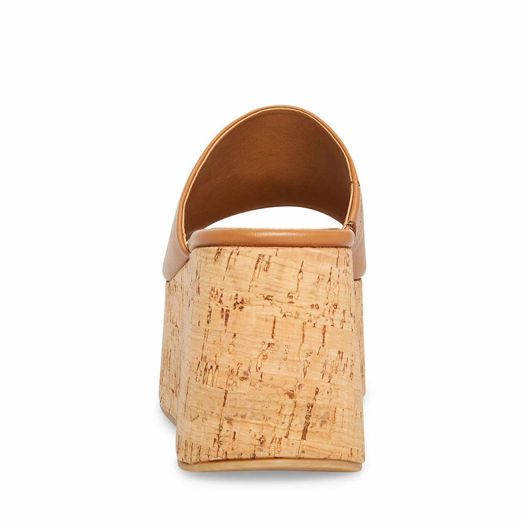 The CALYSTAΒ sandalΒ is a wide leather single strap slide set on a cork wrapΒ platform.