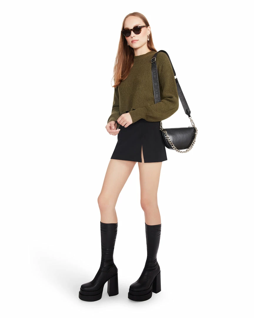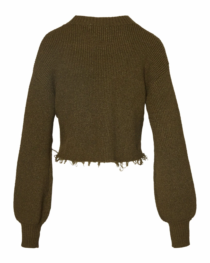 CAMILLE is a pullover crew neck sweater with a cropped distressed hem and cuffed bishop sleeves.