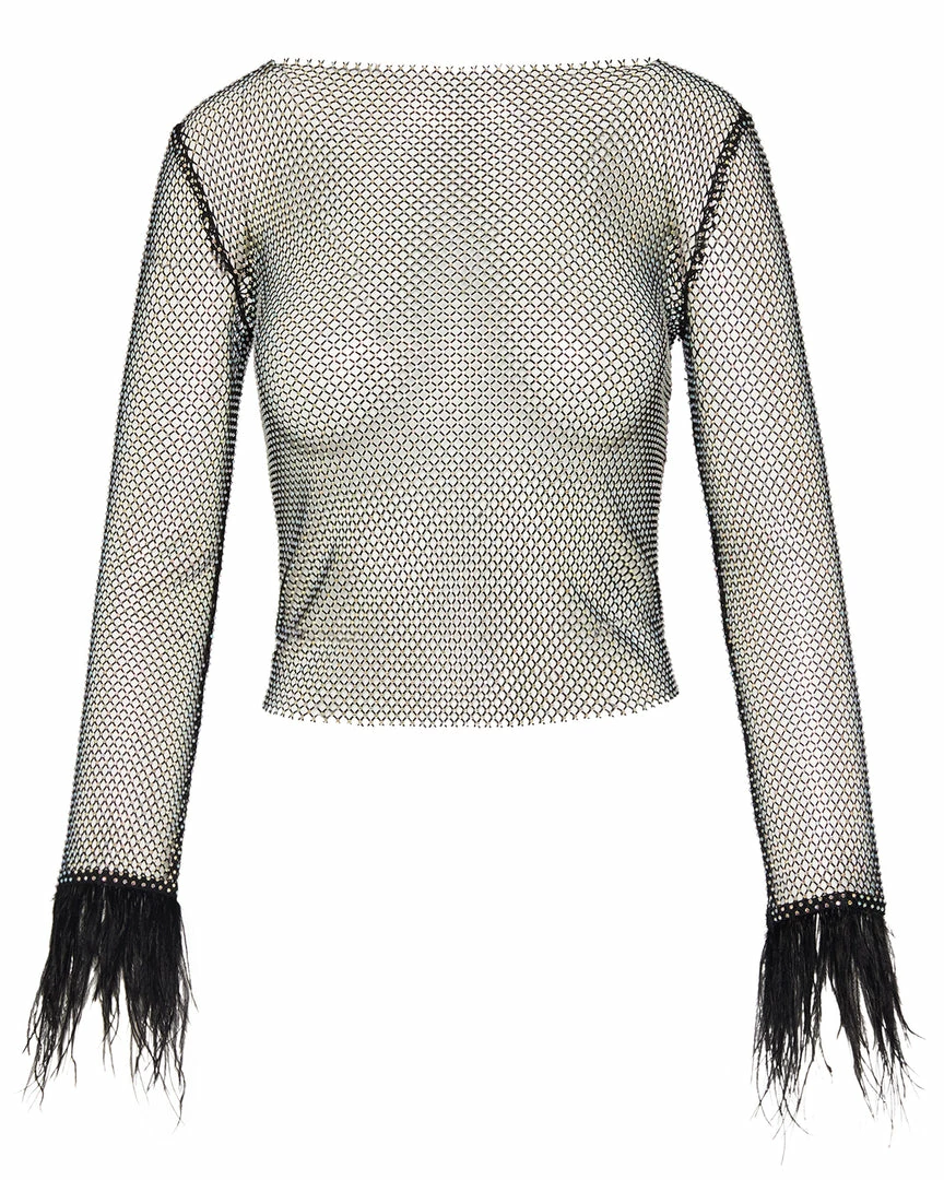 The CHARLIZEΒ top features a loose long-sleeved tunic silhouette in our iconic sheer rhinestoneΒ mesh, finished with feather trim at the sleeve.