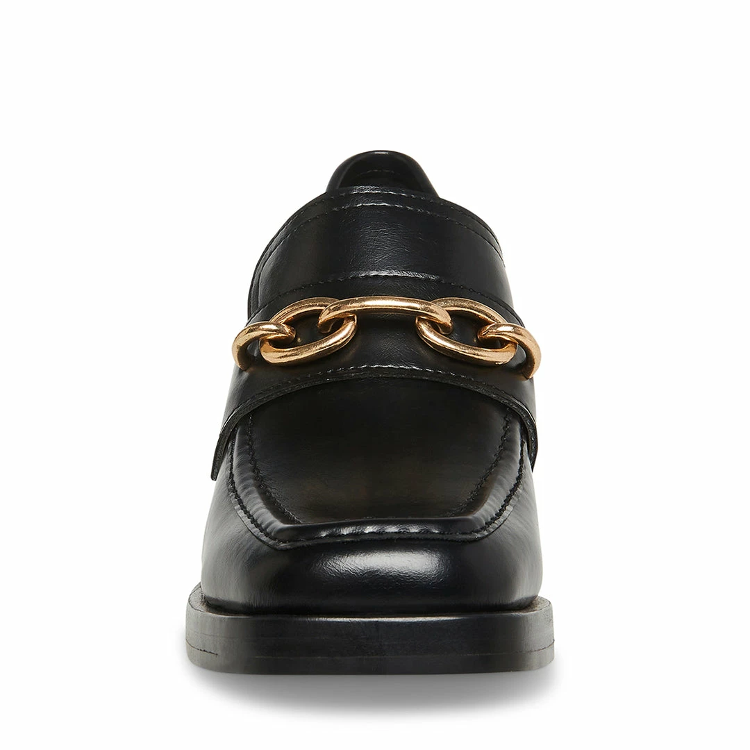 A chunky block heel with a front platform elevates the CLARKSON loafer. Oversized chain hardware across the top finishes the look.