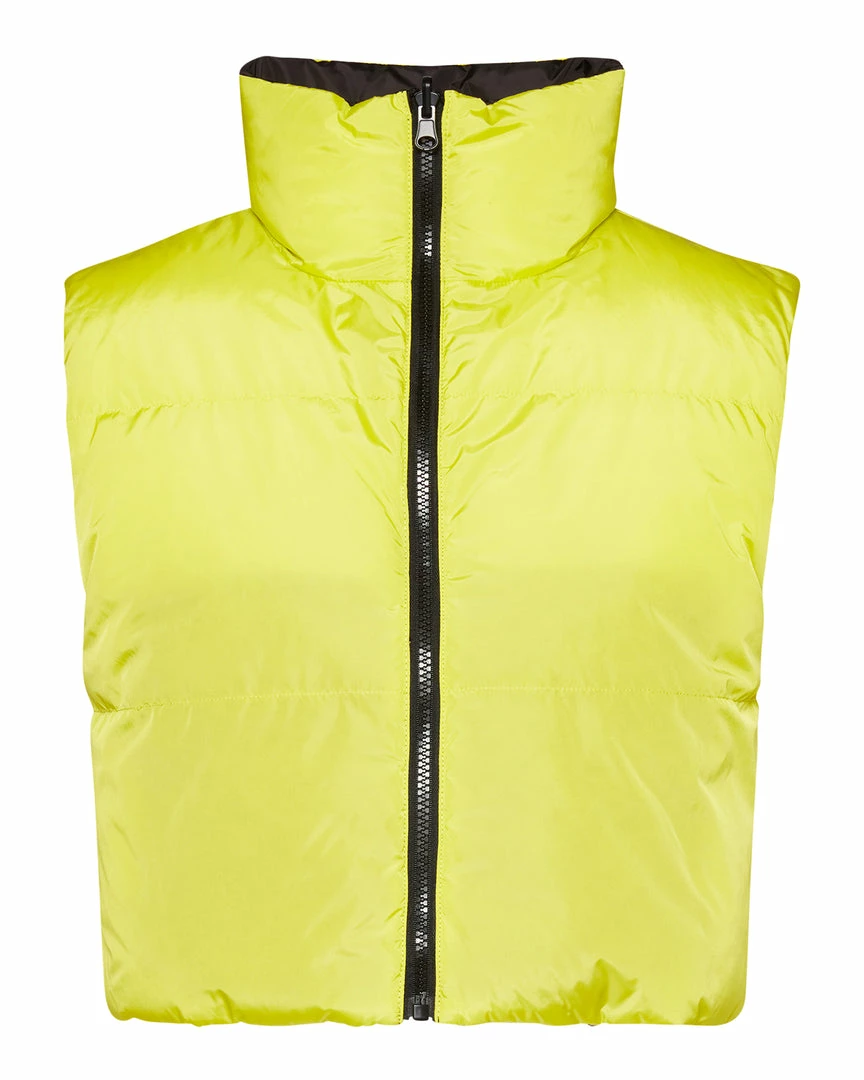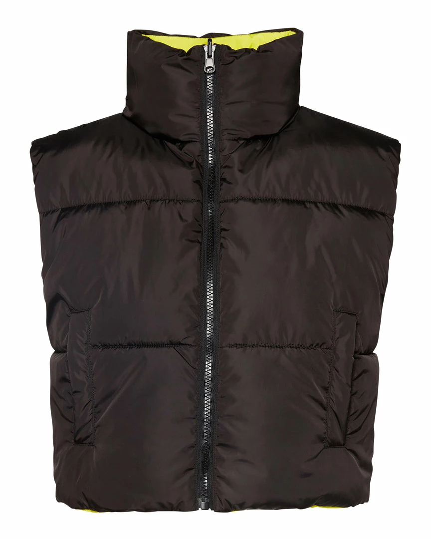 The DAISY puffer vest is a cropped design with a high neck that shows off the contrast color lining.