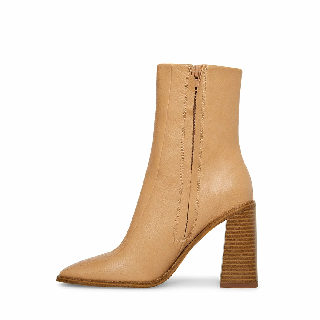 A squareΒ heelΒ and an elongated square toe define the silhouette of the DONNA vegan leather ankleΒ boot.