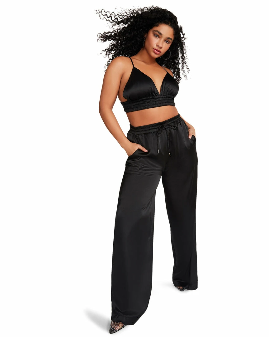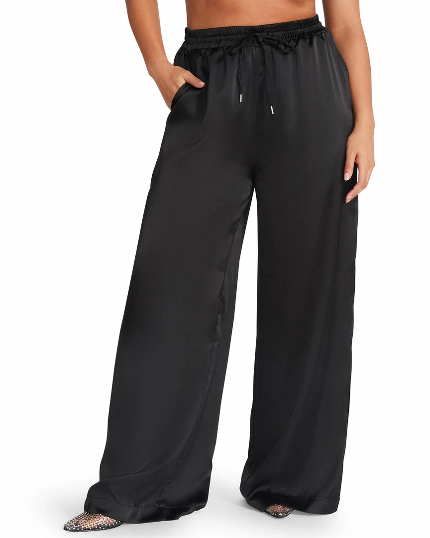A wide leg cut and smooth satin fabric give the pull-on DORIAN pant a loose, flowing silhouette.