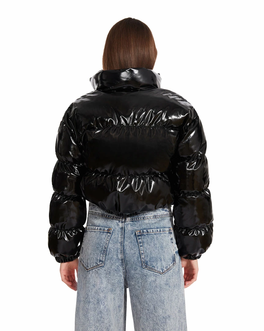 EDEN is a short jacket with a voluminous puffer construction and a high shine finish on the shell.