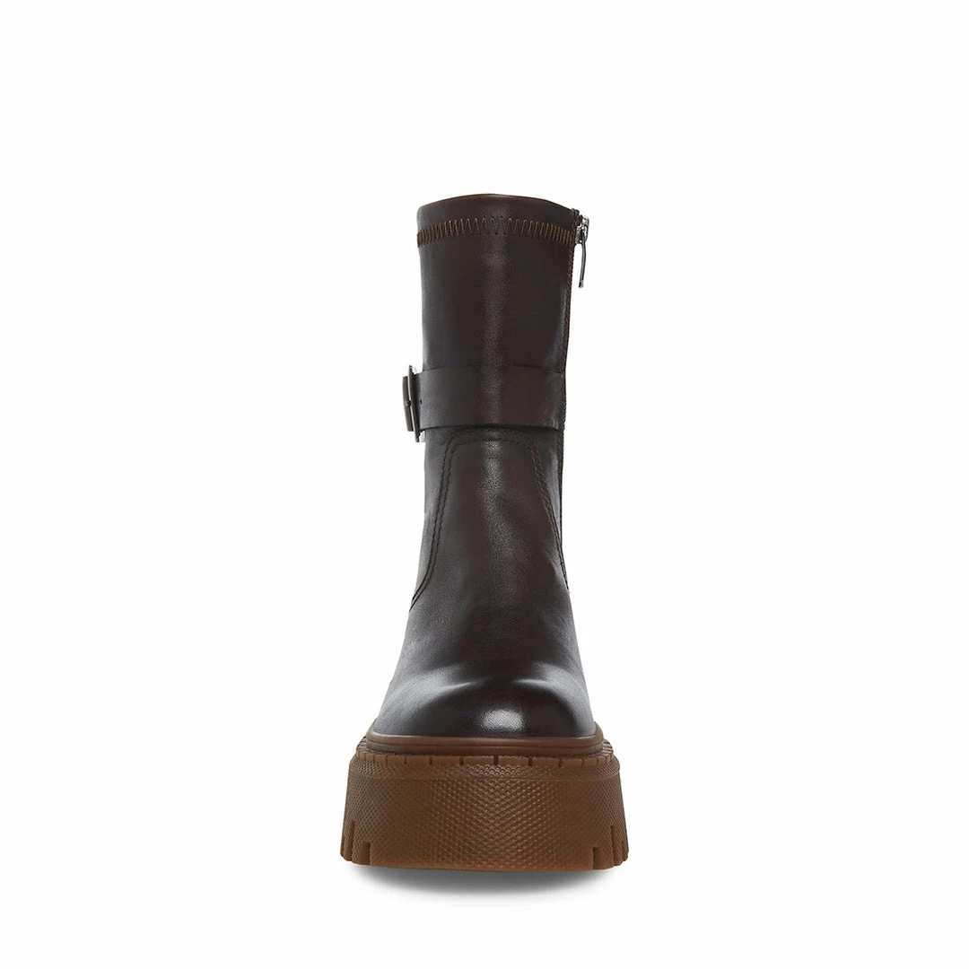 The EVERLYΒ bootΒ sets a luxurious leather mid calf design on a wide treadedΒ platformΒ sole.