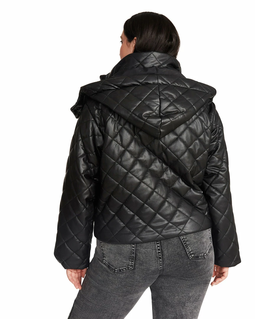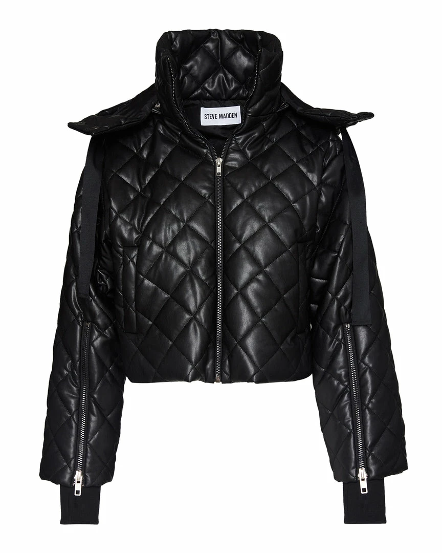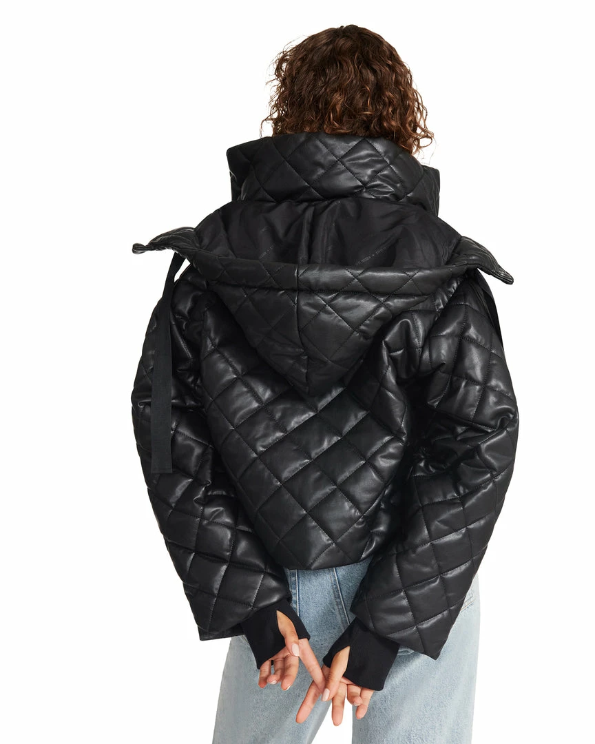 The cropped HAYLE jacket is a fully lined hoodedΒ jacketΒ with a quilted shell inΒ vegan leatherΒ for a protective outer layer.