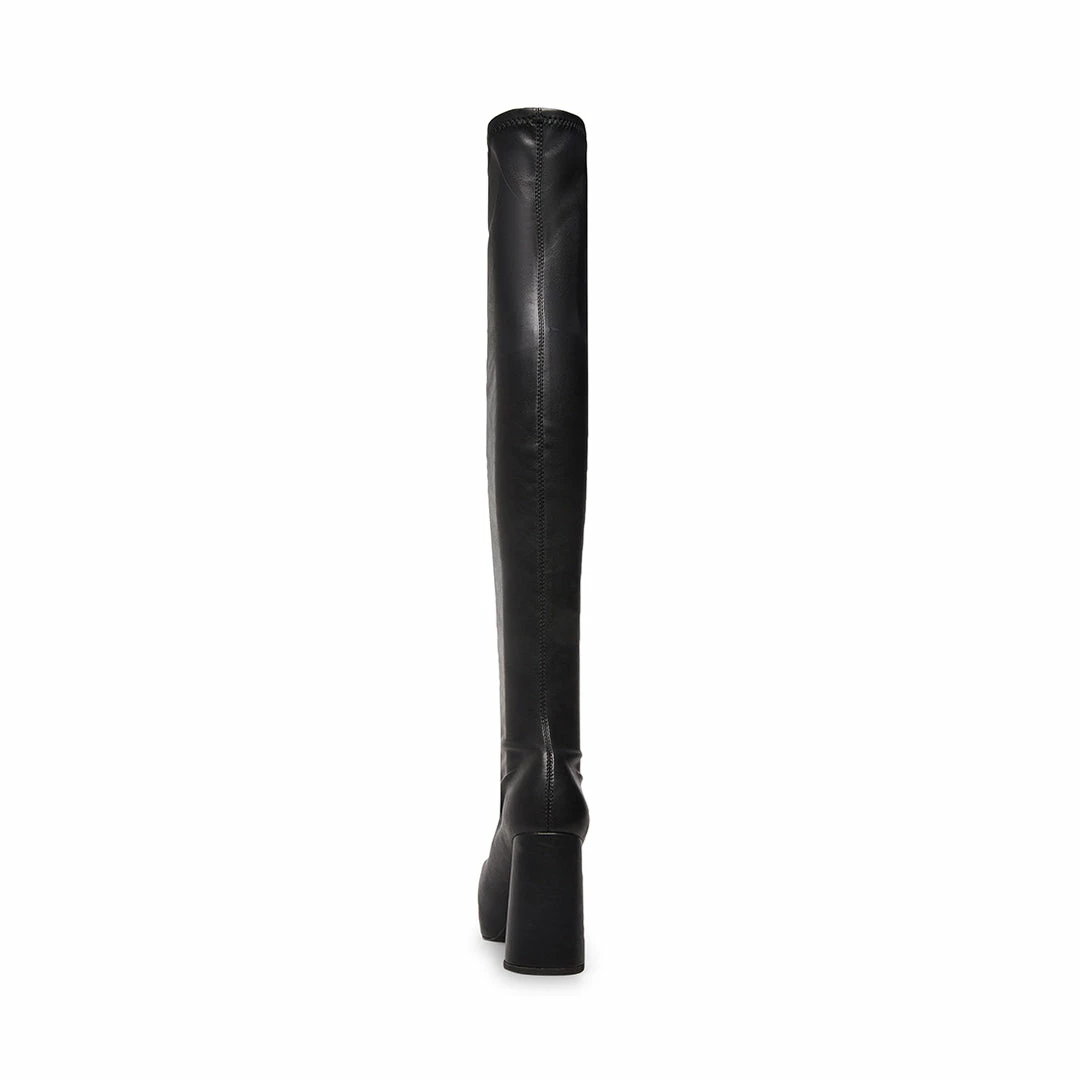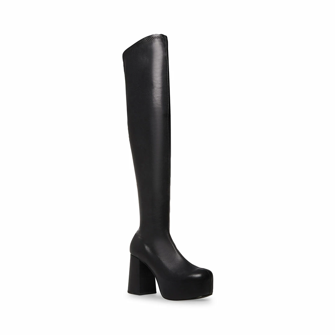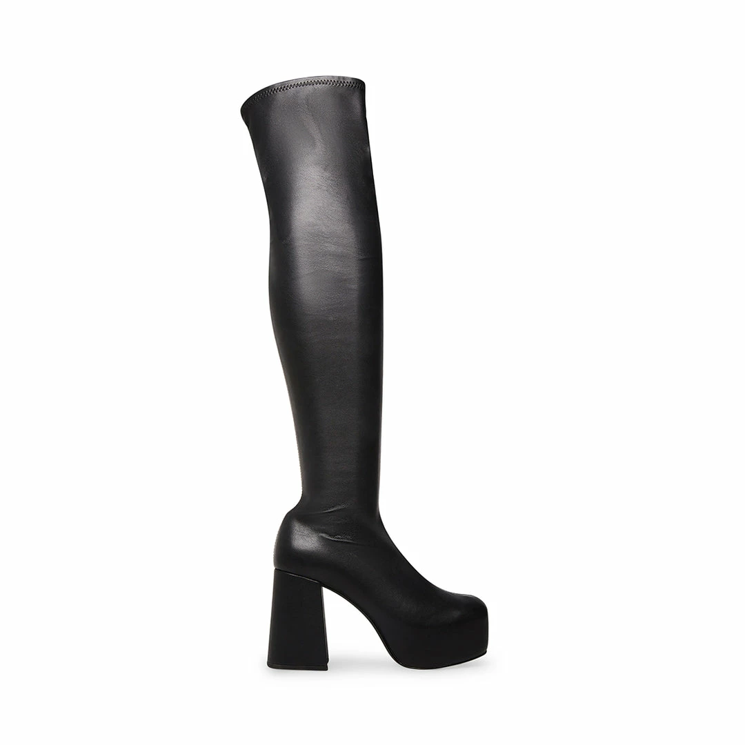 The JOELLE boots feature a stretch thigh high upper set on a platform heel in a fully monochrome design.
