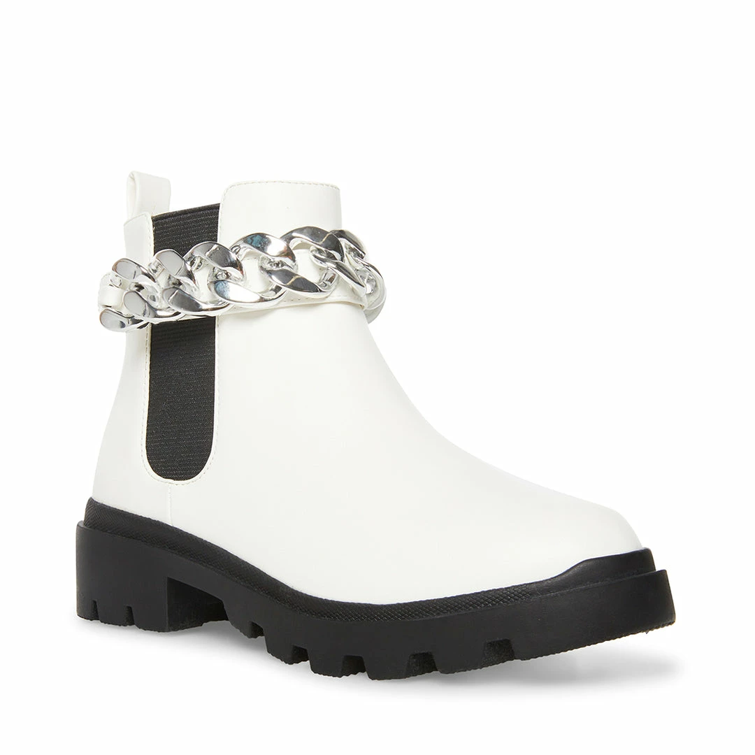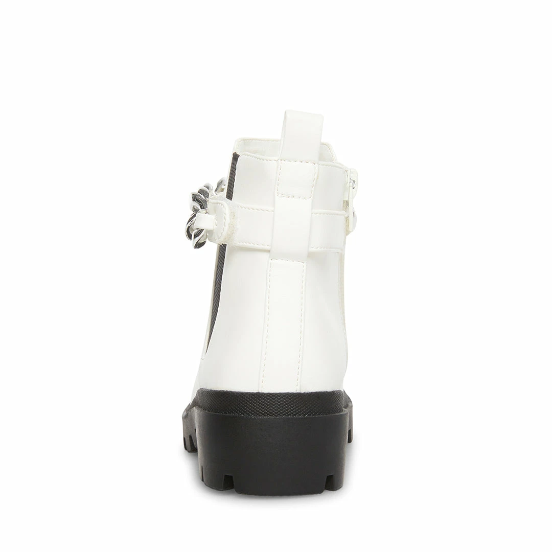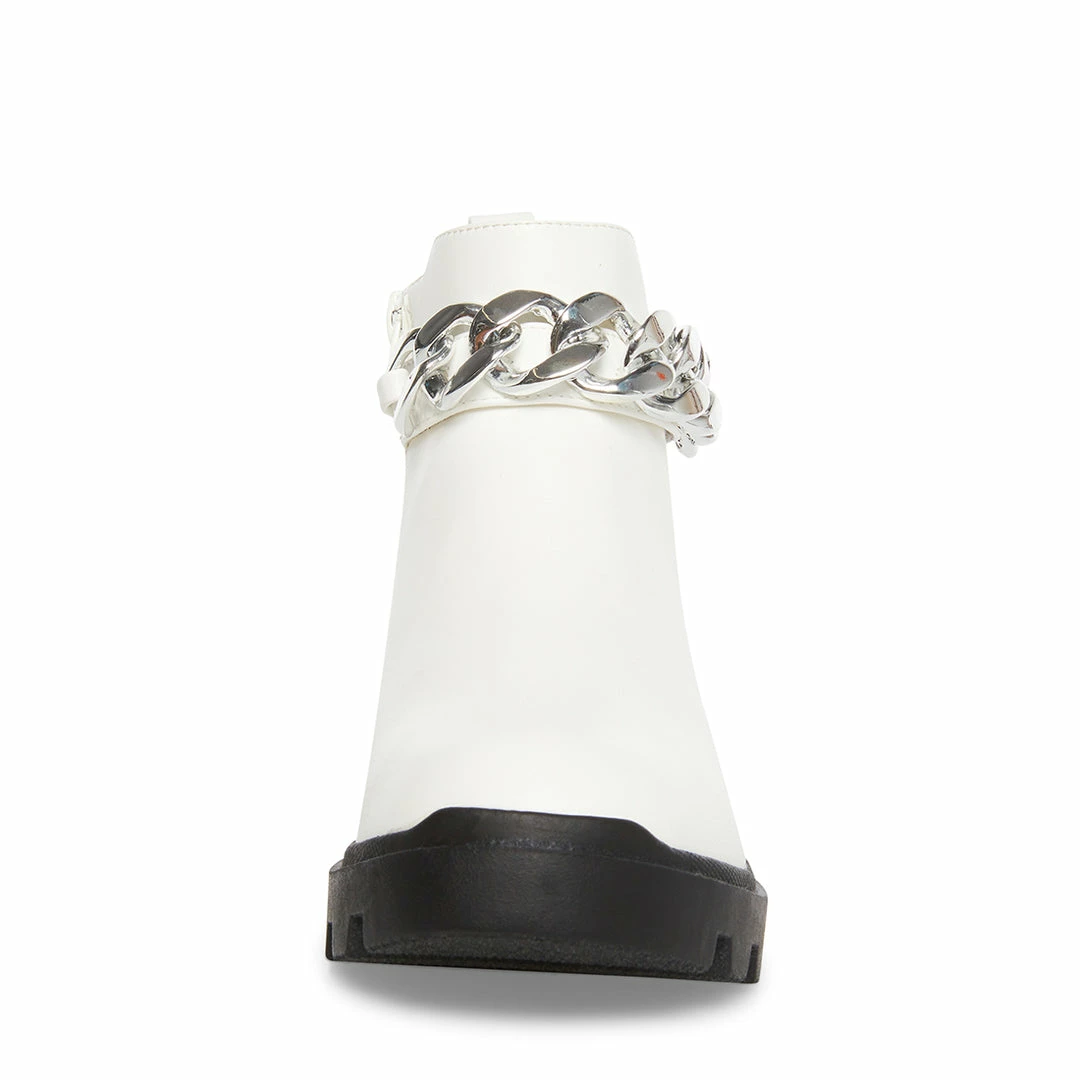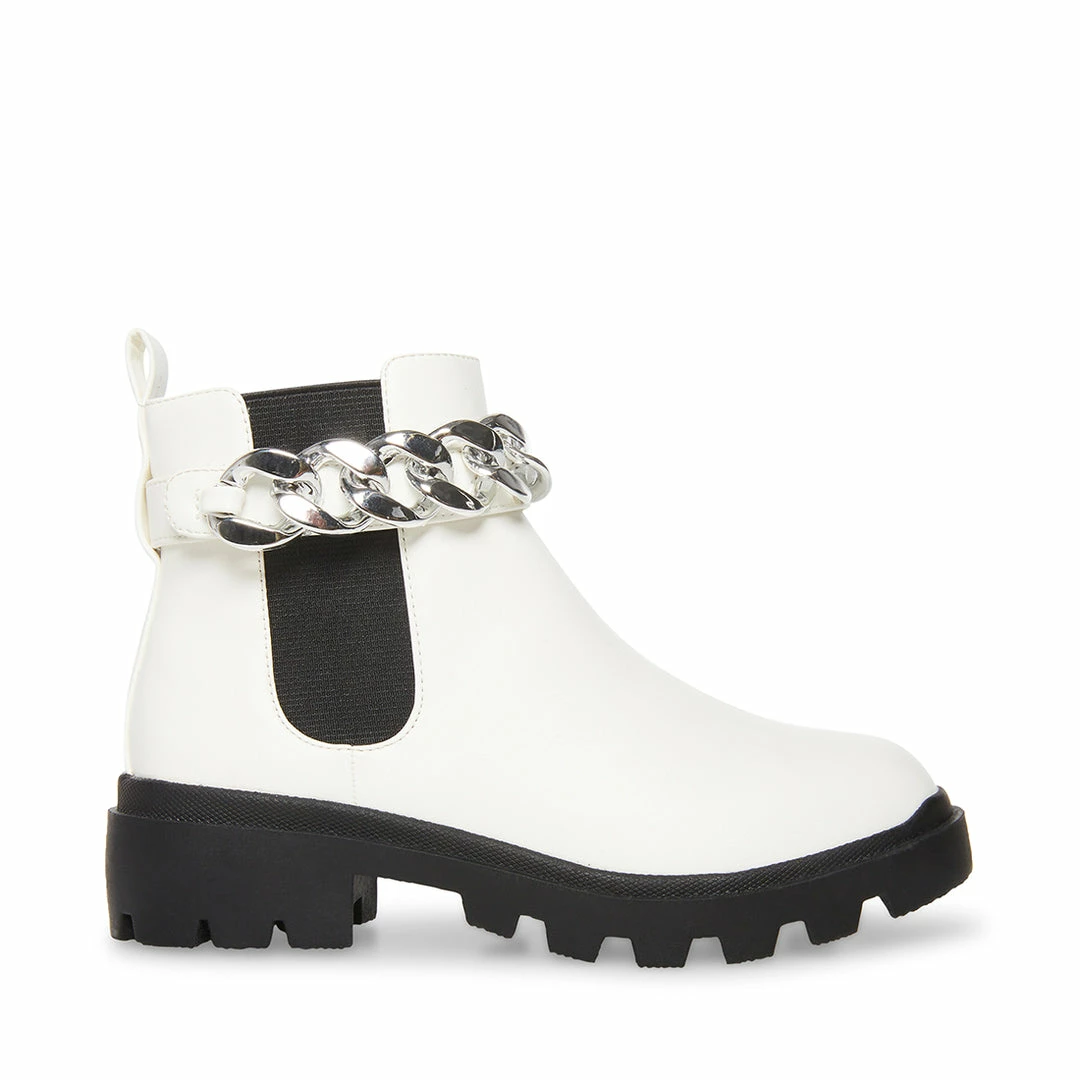 This lugged-sole boot deserves a spot in her shoe closet. A chunky metallic chain detail ups the glam factor to rock star status.