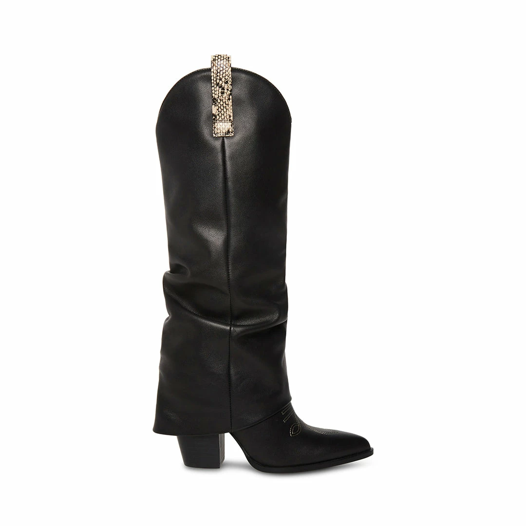 Decorative stitching and faux snake accents give the LASSY knee boots a Western edge with a point toe and an angled heel to complete the theme. The foldover construction adds a slouchy style to these knee high boots.