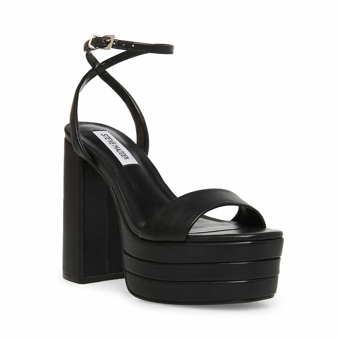 LIA is a monochrome sandal design on a high block heel with a stacked front platform.