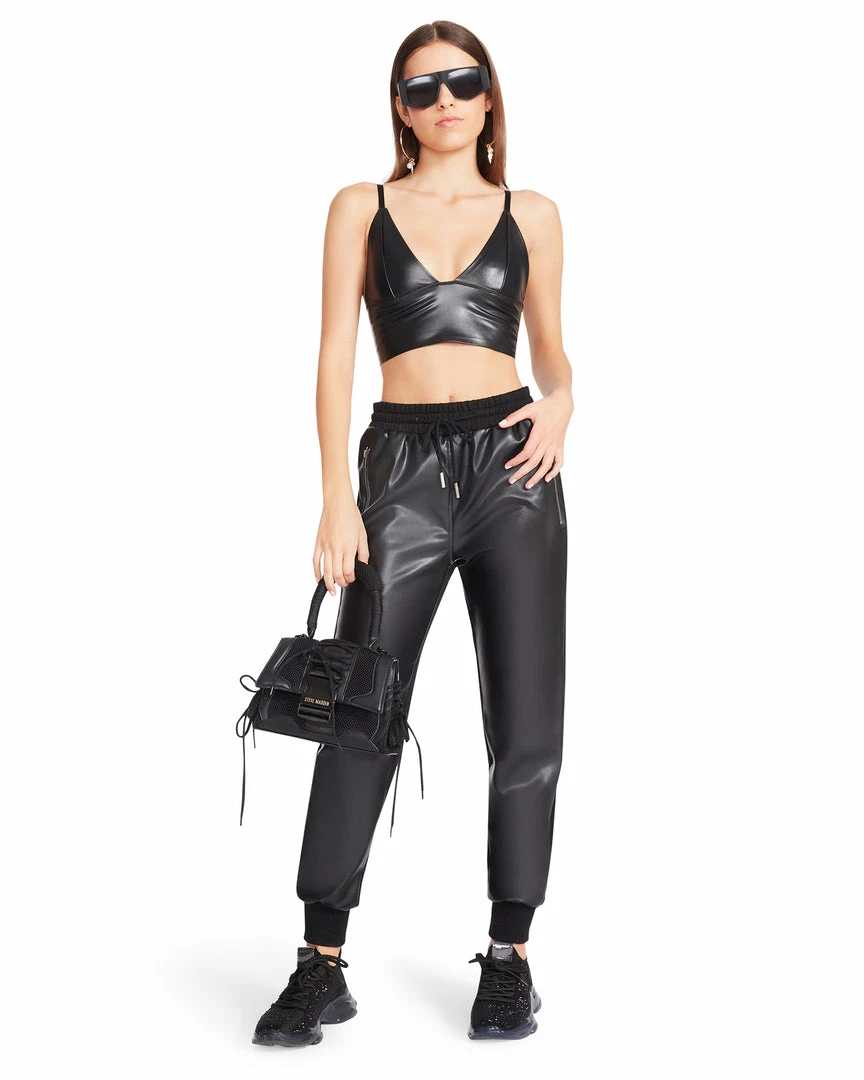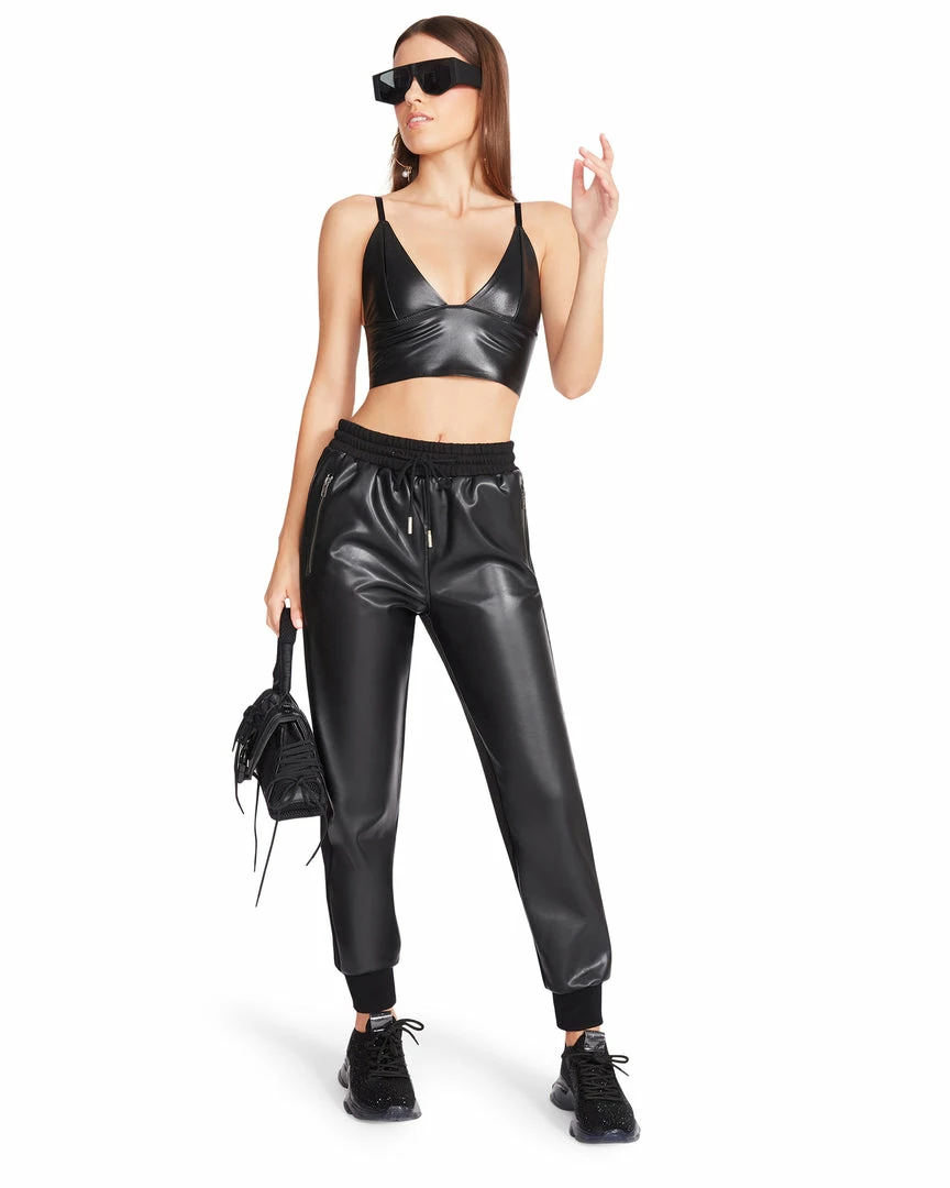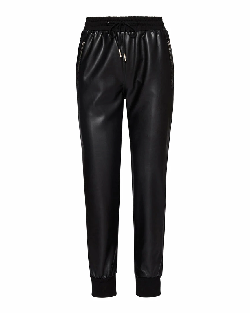 The MARIA pants are a jogger design done in vegan leather with elastic in the waist and cuffs.