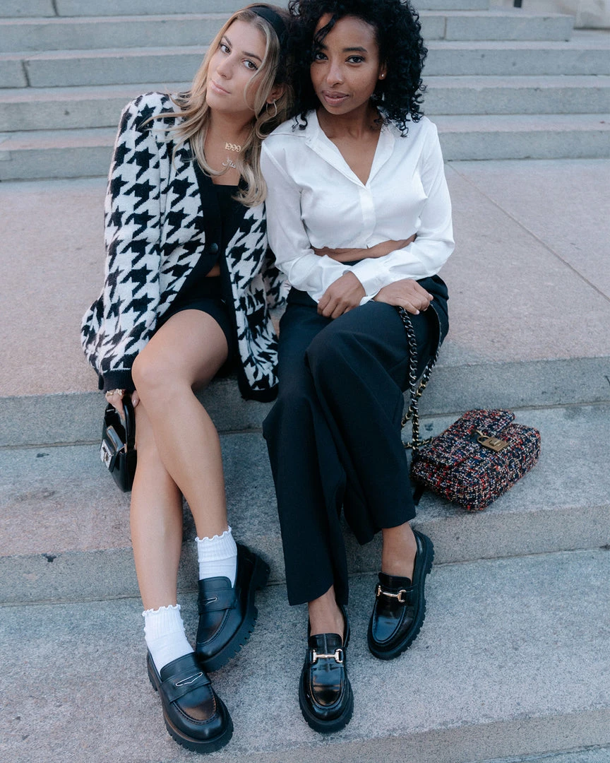 MARINA is a fuzzy oversizedΒ sweaterΒ in a houndstooth pattern with solid trim on the cuffs, collar, and waistband.