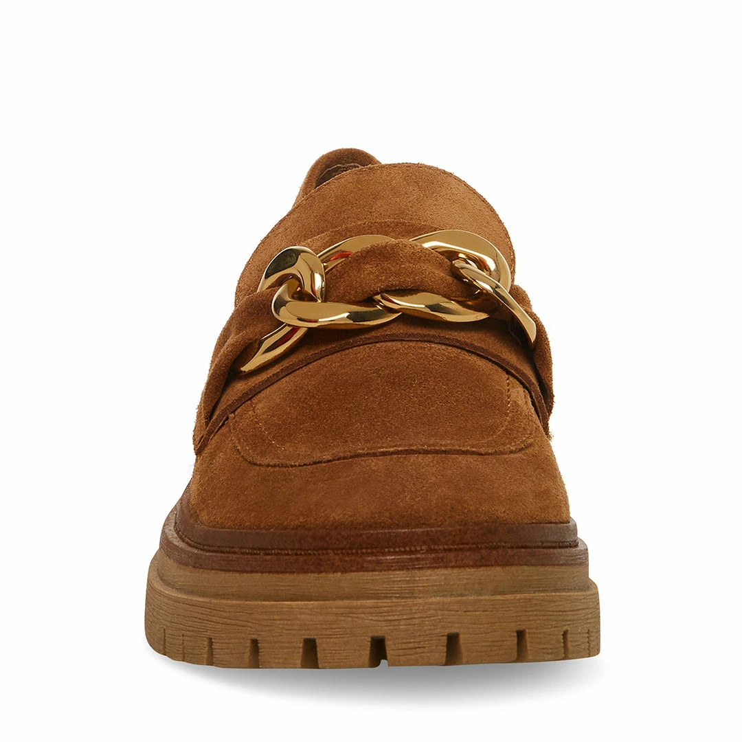 REGINA is a suede loafer topped with a curb chain embellishment and finished with a stacked treaded sole.