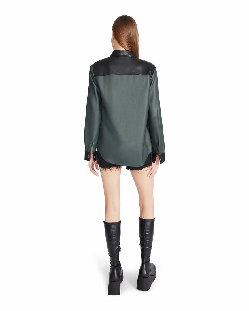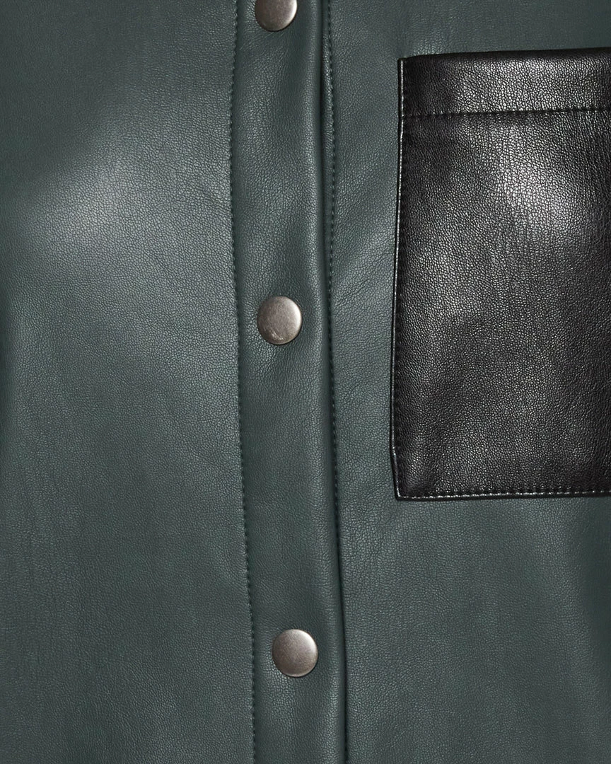SAM is a classic collared and buttonfrontΒ shirtΒ design with a twist: the vegan leather fabric makes this a tougher and warmer layering option than most.