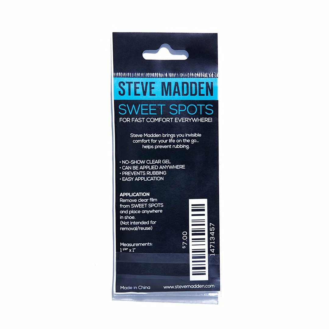 Steve Madden brings you invisible comfort for your life on the goβ¦.helps prevent against rubbing. SWEETSPOTS will help prevent painful blisters on your heels, and can be applied anywhere on your shoes to ease friction.Β Maddenβs gel pads cushion your foot so you can walk all day (or night!) in comfort. They stay in place and keep your feet cool, dry and fresh.