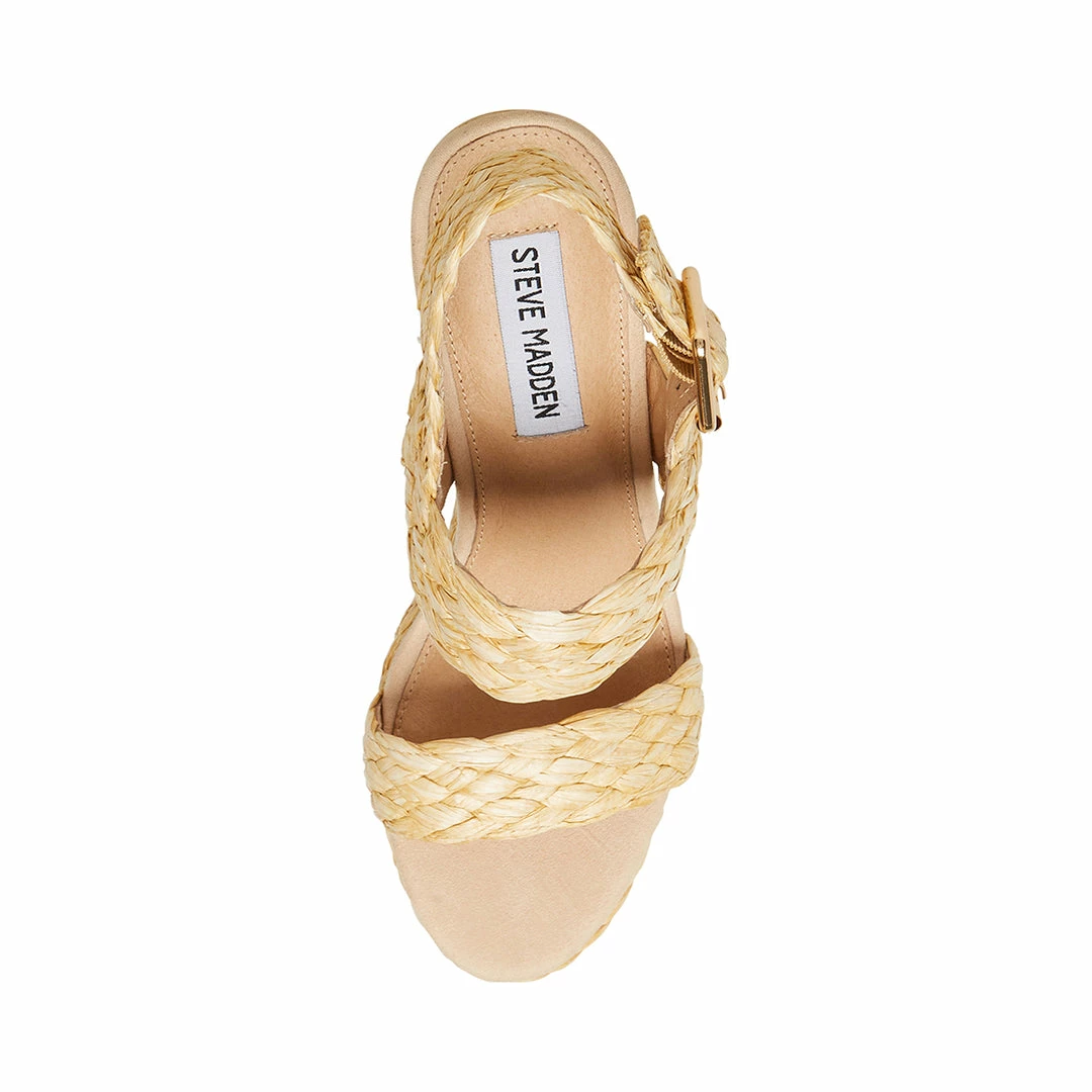 The SIMONAΒ sandalΒ is designed with wide straps that secure to a platformΒ wedgeΒ wrapped in raffia braid.