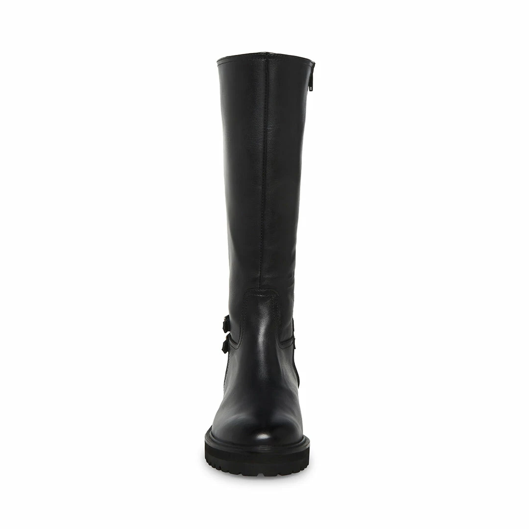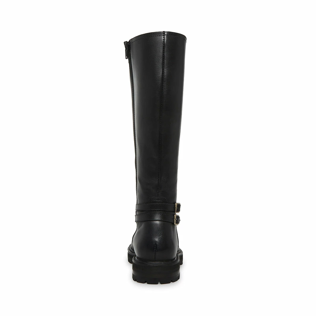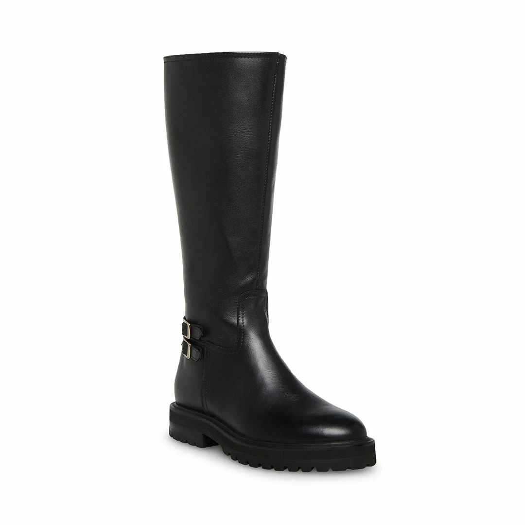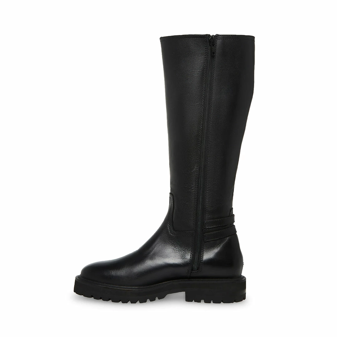 SOURCE is a leather knee boot in the classic riding boot style accented with straps around the ankle and finished with a treaded sole.
