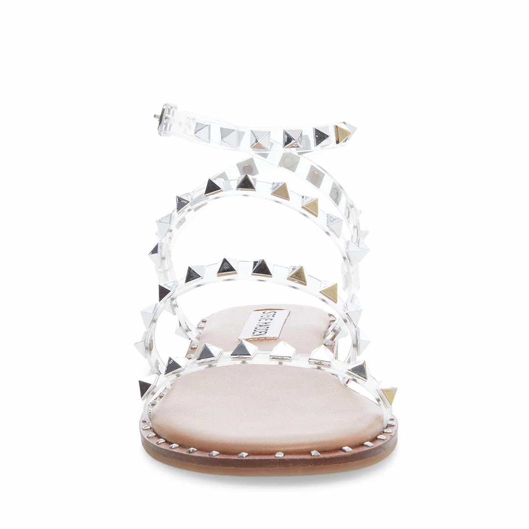 Crossing delicate skinny straps with edgy metal pyramid stud embellishment, the TRAVEL sandal is at once fierce and feminine. Style with a draped maxi dress for a goddess-worthy look.Β