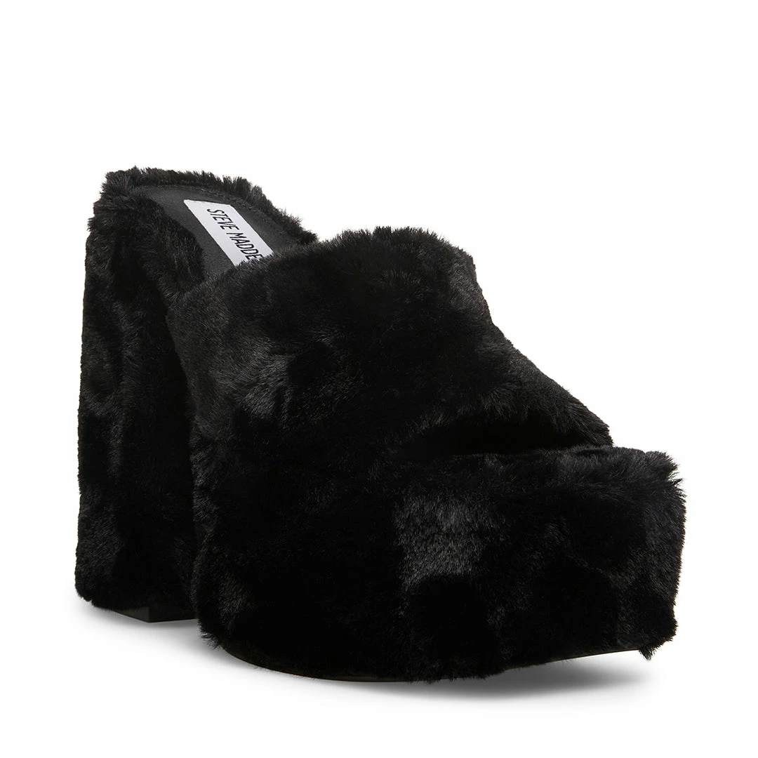 The TRIXIE-F slide sandal is covered with soft faux fur from the square toe to the wide top strap and the high block heel.