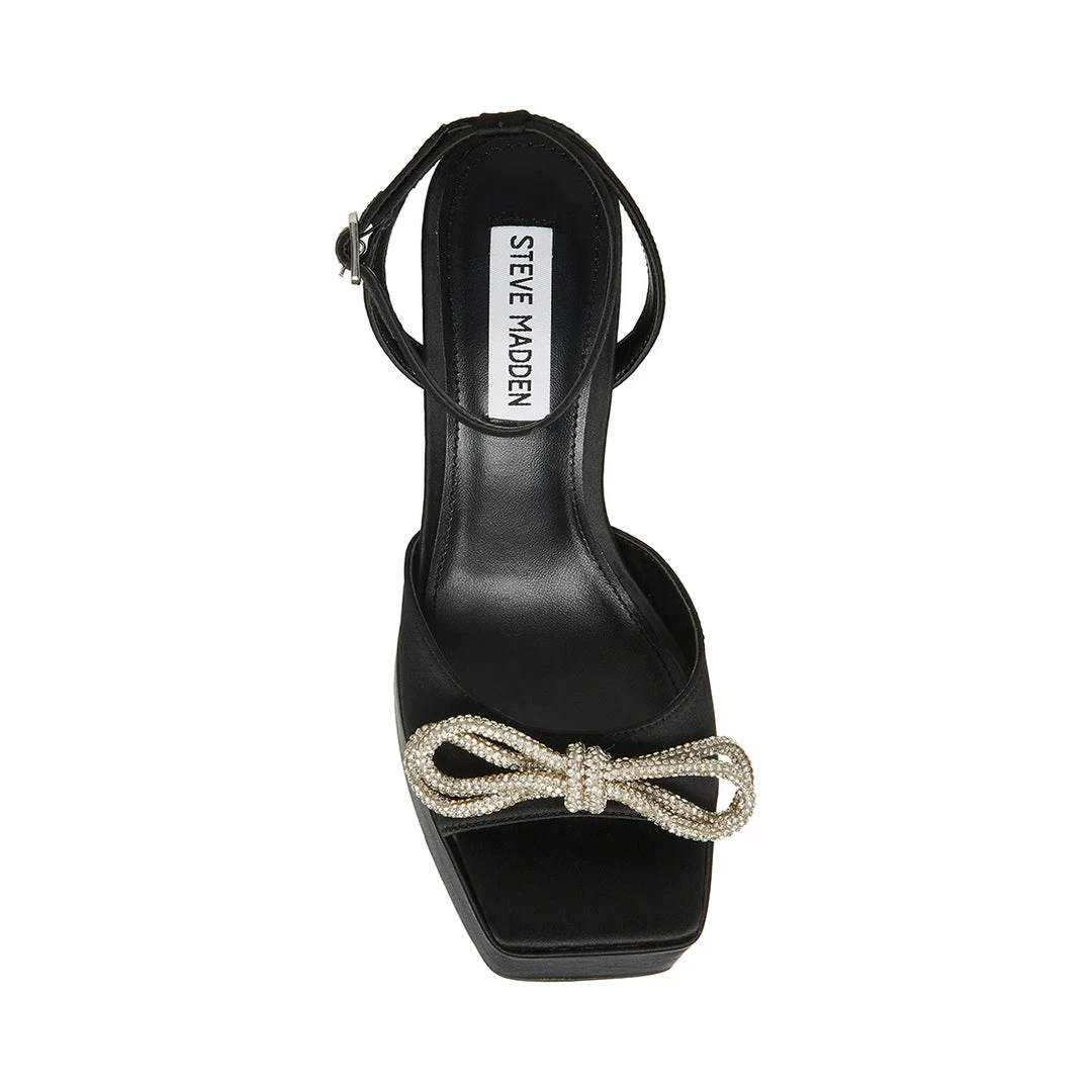 The VICE sandal is set on a square heel with a matching square toe and topped with a rhinestone bow.