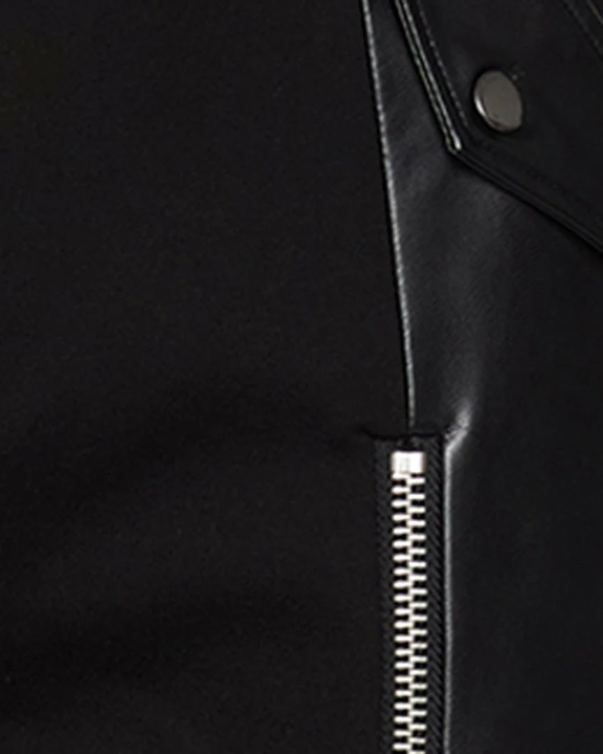 - Faux leather panels with zipper hardware accents