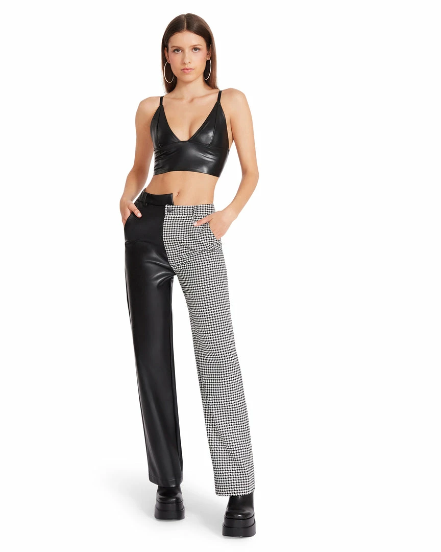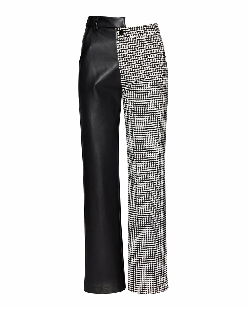 MACKENZIE is a split color trouser design that contrasts vegan leather with houndstooth pattern fabric.
