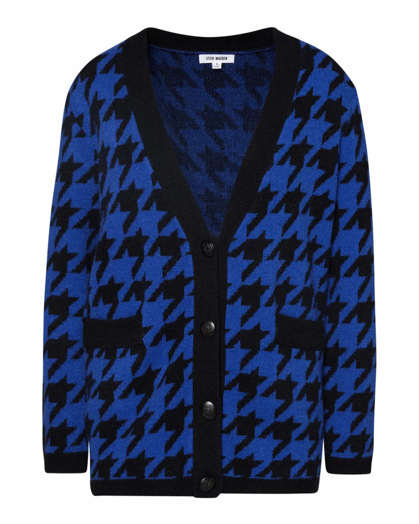 MARINA is a fuzzy oversized sweater in a houndstooth pattern with solid trim on the cuffs, collar, and waistband.
