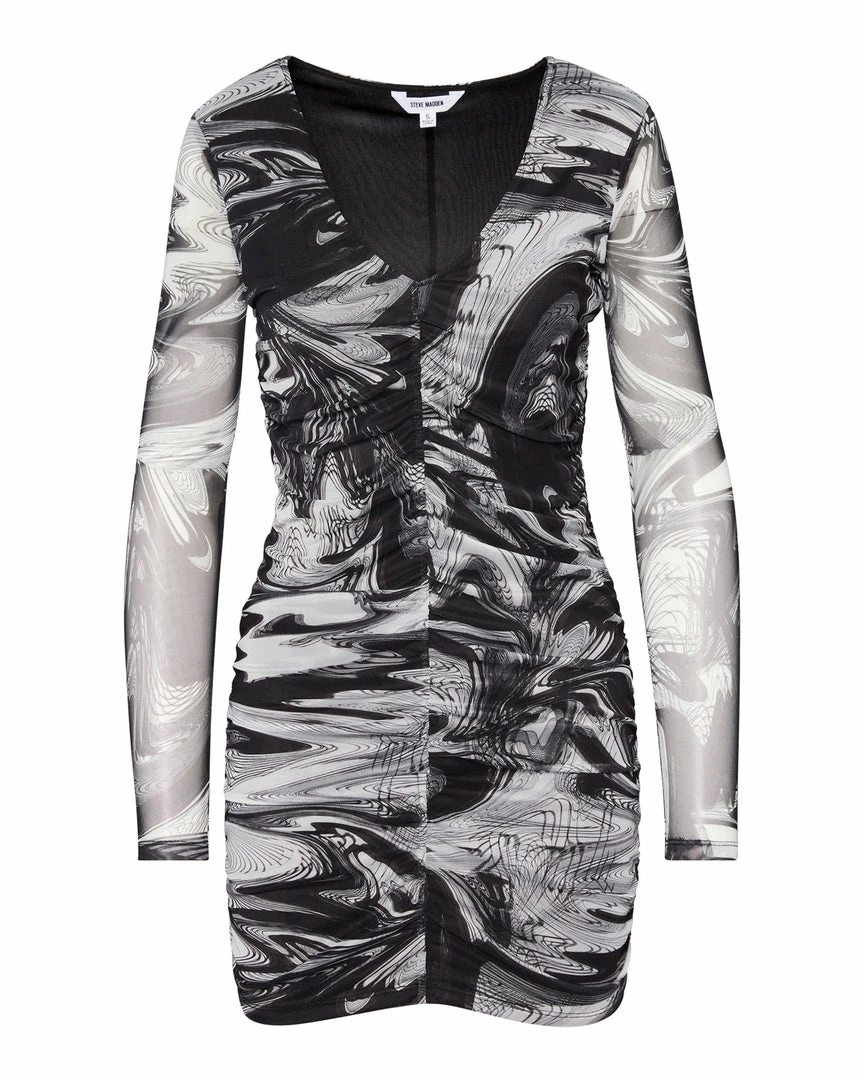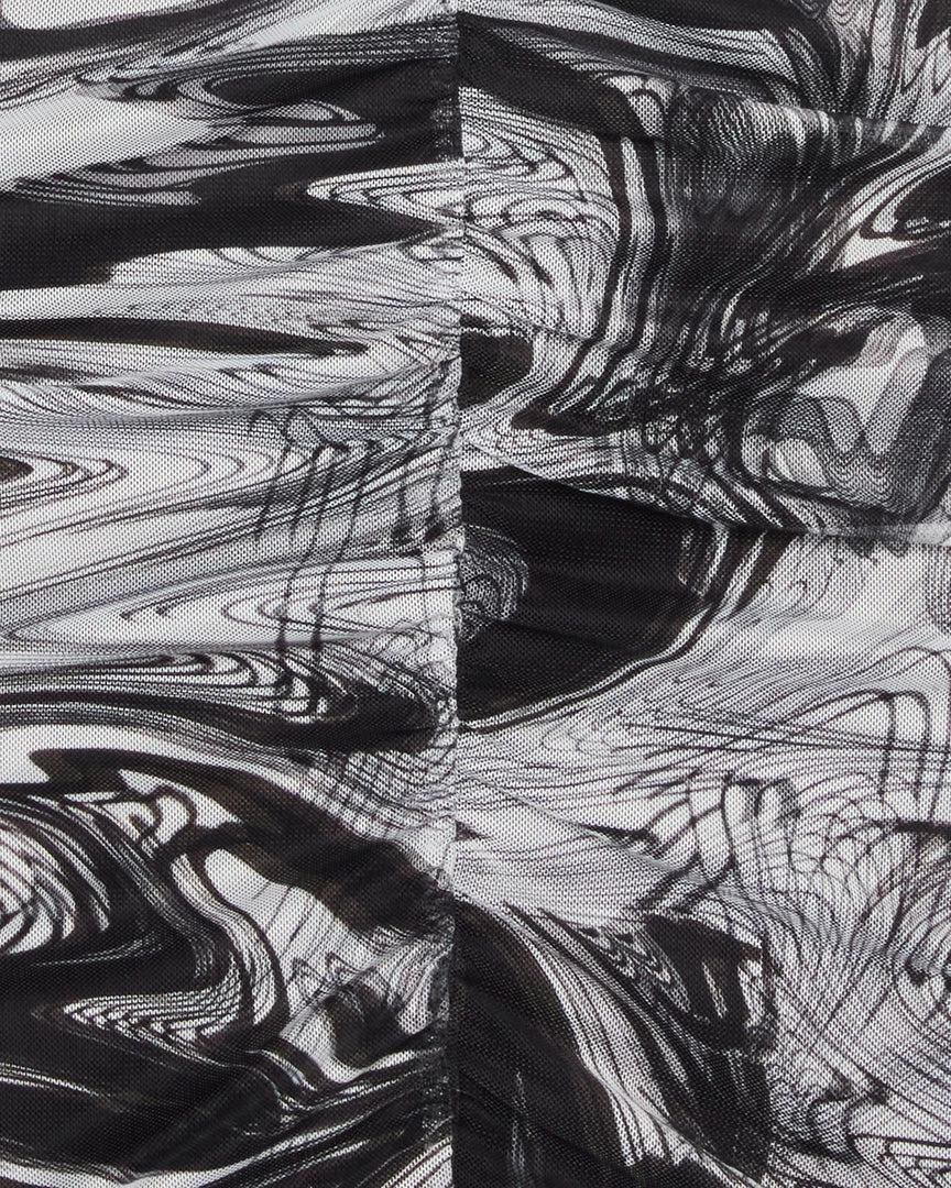 The TESSA features a long-sleeved sheer mesh dressΒ in a swirled marble print layered over a slip.
