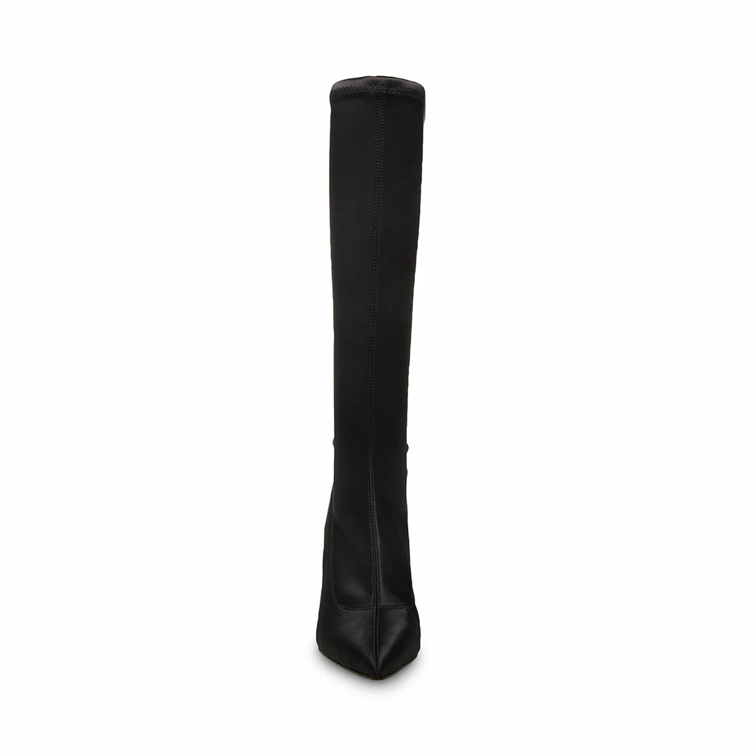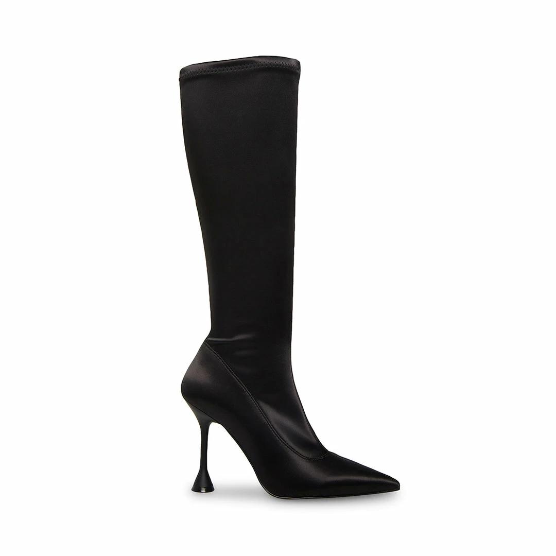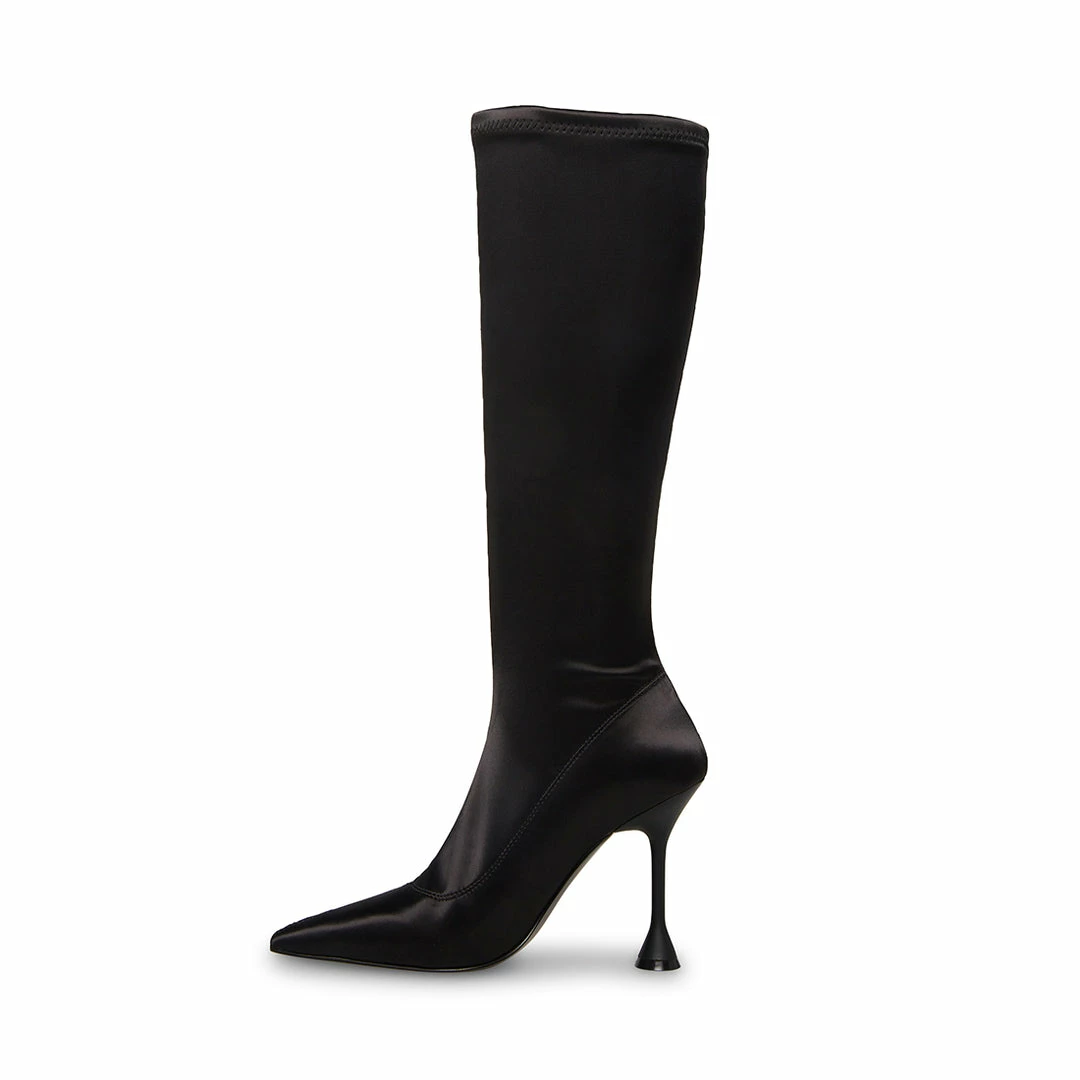 ESTELLE is a knee boot in a smooth stretch satin design that sits on a sculptural stiletto heel and a pointed toe.