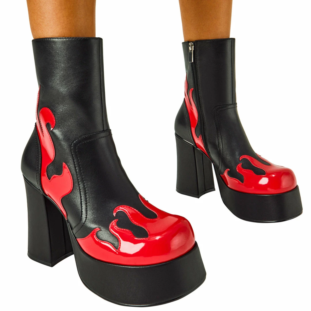 The SIZZLE platform heel boots are embellished with flame shaped panels at the front and back that contrast with the leather ankle height upper.